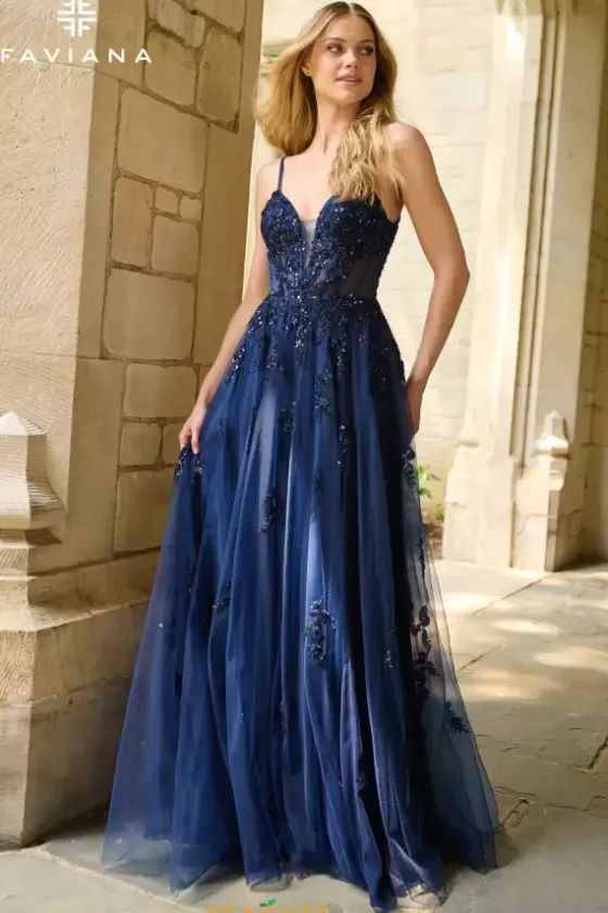 Have a magical night wearing Faviana long dress 11413. This gorgeous a line dress showcases a low v neckline with simple shoulder straps. Flowing effortlessly from the fitted beaded bodice, the soft tulle skirt is adorn with unique floral applique that will be sure to have to leave a lasting impression.