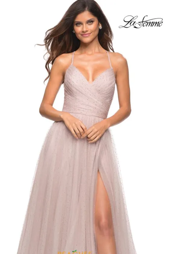 Fun and flirty, have all eyes on you as you rock this long a line dress 30536 by La Femme. The cross over draped bodice is ultra flattering and features a v cut neckline. The tulle a line silhouette is delicately adorned with sparkling beadwork. To ensure the perfect fit, a lace up open back is showcased.