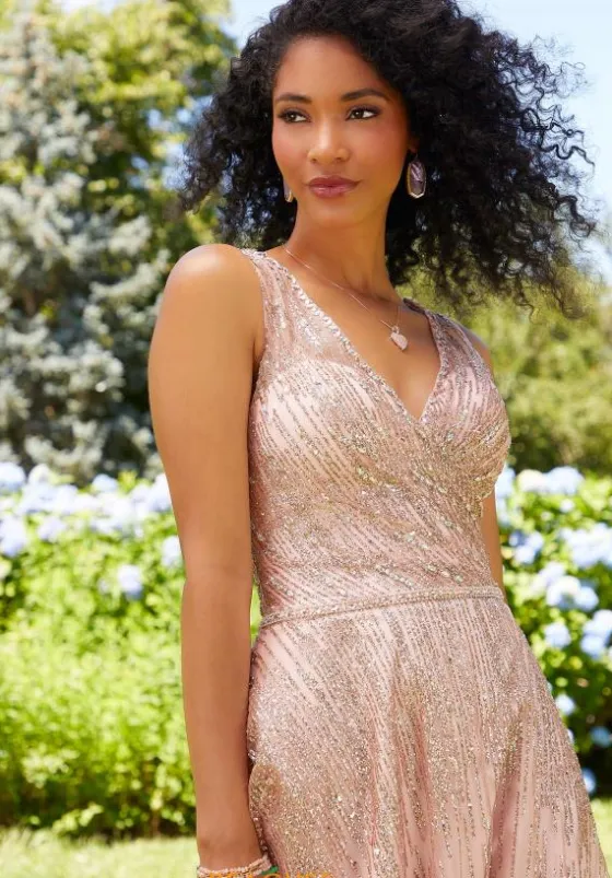 We are just in love with this amazing Morilee dress 47073. Made from sparkling glitter tulle this v neckline bodice showcases thick shoulder straps and ruching details to one side. A thin beaded belt wraps around the small of your waist showing off your figure. The flowing a line skirt then flares out from the belt and has a front side slit complete this gorgeous style.