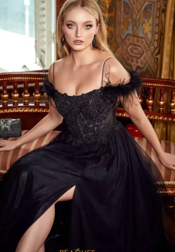 Turn heads when you step into the room wearing haute dress 61328 by Alyce. The off the shoulder neckline and feathered cap sleeves compliment the fully beaded corset bodice while the small of your waist begins the flared out tulle skirt that will have you walking effortlessly with a classic thigh high slit and sweep train.