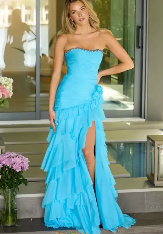 Look romantic and chic in this swirling chiffon Ava Presley long dress style 42242 trimmed with tonal stones along the top. This sensational silhouette showcases a strapless fitted bodice with ruching, drop waist with rosette detailing and zipper back. The long, a line skirt has tiered ruffle layers with a front slit and back sweep train. Blush color has tonal stones.