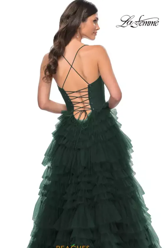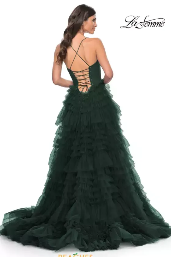 You will attract all attention when you make your entrance wearing this captivating La Femme A-line 32071. Available in dark colors, this dress appears ultra flattering and consists of the traditional adjustable fitted corset bodice that contours the small of your waist to be enhanced by the notable ruffle tiered tulle skirt completed with a thigh high slit and immense sweep train.