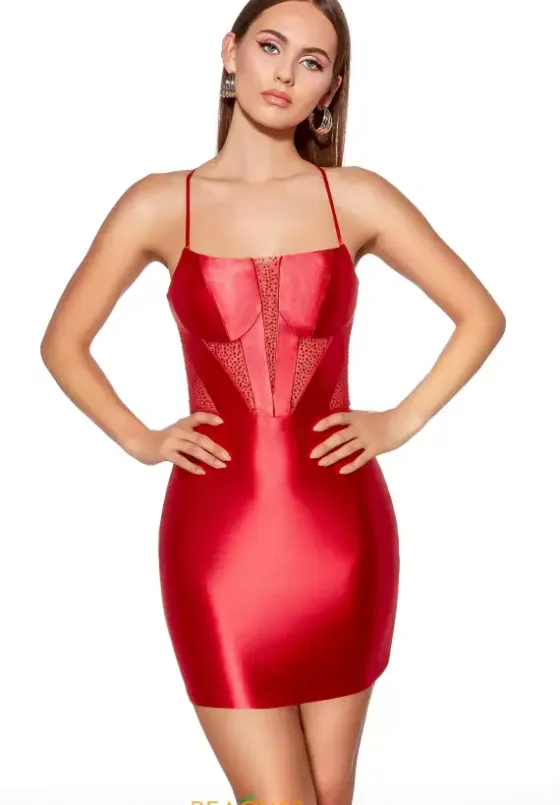 Turn heads at this years homecoming in this shimmering Alyce Paris short dress style 40018 made in body conscious stretch satin. This sensational style showcases a corset lace up back bodice with illusion panels embellished with heat set stones, and spaghetti straps. The short slim skirt will show off your legs beautifully.