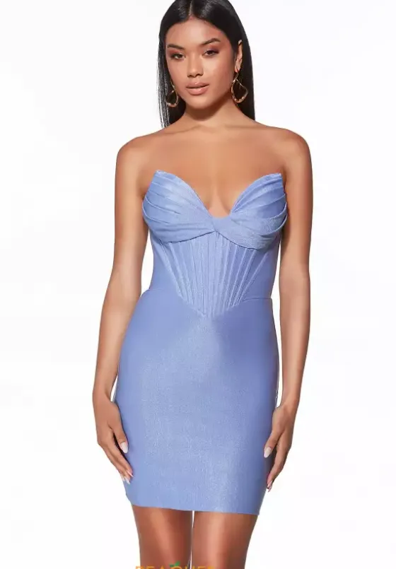 Stay on trend at this years homecoming dance wearing this Alyce Paris short dress style 40042 made in shiny jersey fabric. This impeccable silhouette showcases a corset bodice with visible boning, cat-eye neckline with pleating and low back with center zipper closure. The short, slim skirt is a mini length.