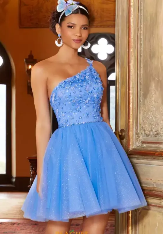 We are just loving this on trend short dress 9584 by Morilee Damas. The bodice showcases a single shoulder asymmetric neckline adorn in sparkling bead work and three dimensional floral details. Glitter tulle gives an extra sparkle factor to the aline style skirt. Available in stunning colors, this dress is perfect for any special occasion.
