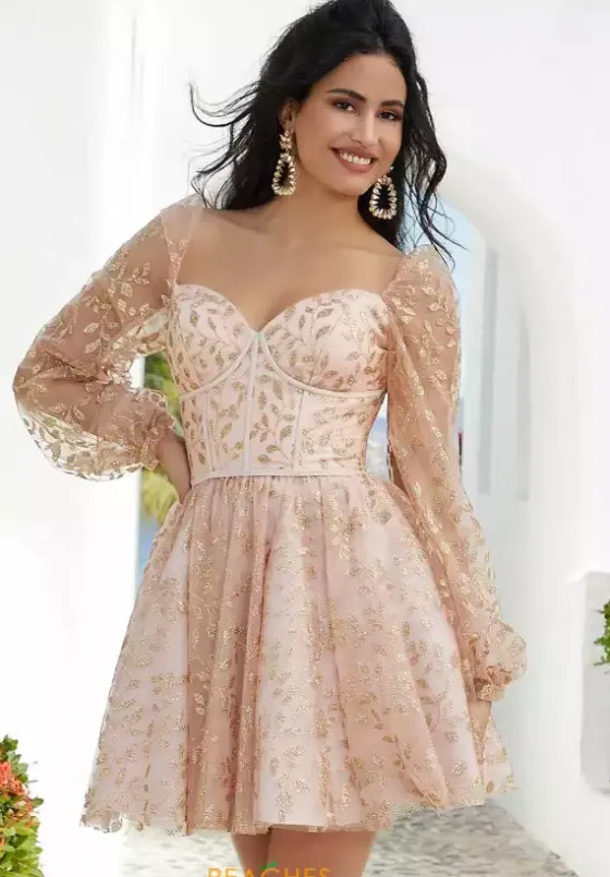 Have a fabulous entrance in this short Morilee Damas dress 9591. Featuring a flattering sweetheart neckline that is paired with gorgeous illusion sleeves. Showcasing the fitted corset bodice that is exquisitely embellished with floral glitter sequin and cascades down the flowy tulle skirt to have you glistening perfectly all night long.