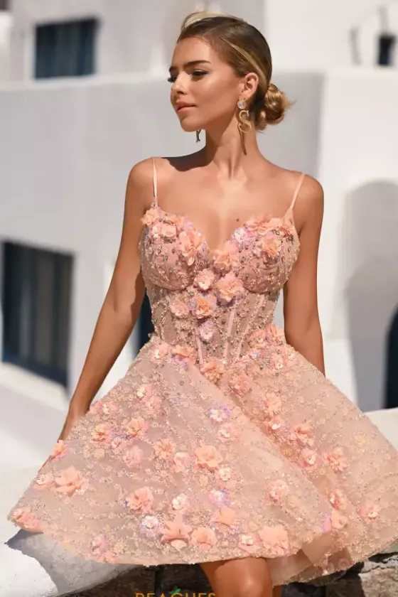 Dance the night away with this short and A line style dress made by Portia and Scarlett, style PS24703. This V shaped neckline dress is completely strapless and made with stunning applique and beaded details that will have you dazzling throughout the entire night of your event. This floral dress comes in three amazing color options including a gorgeous green, a a beautiful blush, and and a perfect pink shade as well.