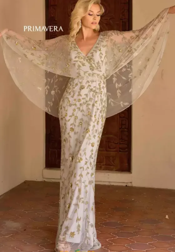 Make a grand entrance in this glamorous gown by Primavera style 13149. Featuring a subtle v cut neckline paired with a stunning cape attached to the straps. Adorned entirely in a stunning beading and sequins made into a chic floral pattern. The fitted silhouette will hug your curves beautifully. A subtle sweep train is added to complete the look.