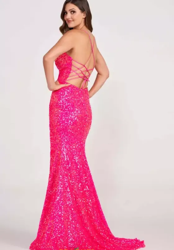 Electrify the crowd when you show up in fun and vibrant long dress EW34015 by Ellie Wilde. Made from a flexible jersey fabric, this dress will pair with the fitted cut to effortlessly flatter your curves. Dazzling sequins adorn this dress from top to bottom giving you the most vibrant and radiant sparkle throughout the night. The scoop neckline is supported by dainty straps that reveal an intricate statement making lace up closure that will allow you to cinch and adjust the bodice to your liking. The fitted skirt consists of a thigh high slit and trendy sweep train.