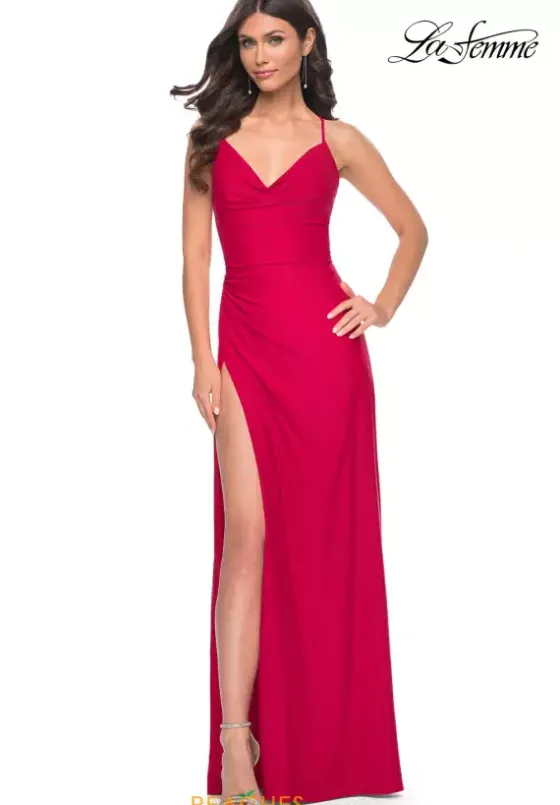 Simply chic is this all over jersey fitted long dress 31978. The jersey material hugs to your shape showing off your figure. The v neckline has thin shoulder straps that criss cross over each other on your open back. The dress then ruches to one side right above the thigh high slit. Available in stunning colors, this dress is a must have.