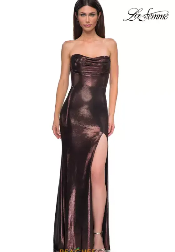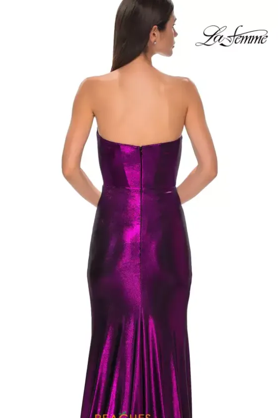 Become your own inner fashion icon when wearing this long fitted dress by the one and only La Femme, style 32828. Featuring a modest strapless sweetheart neckline leading to a back zipper closure. The silhouette of this ensemble will hug your bodice beautifully that will have all eyes on you. Showcasing a unique fitted shiny jersey lame bottom with a classy thigh high slit and a gorgeous train.
