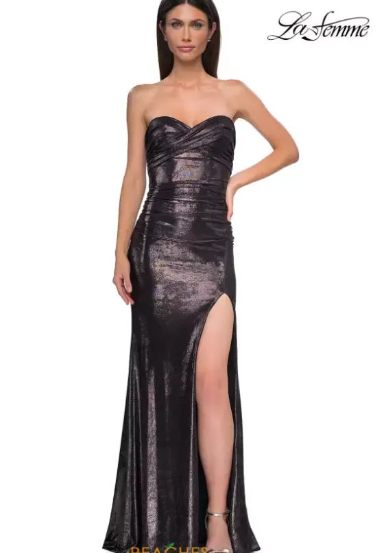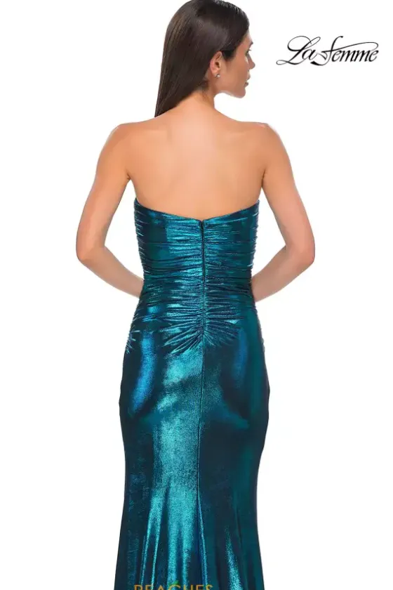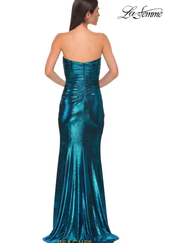 Look Hollywood ready when wearing this long fitted jersey lame dress by La Femme, style 32876. Featuring a strapless modern sweetheart neckline with material that intersects ending with a back zipper closure and ruching on the back of the number. Showcasing a marvelous silhouette that will hug your bodice beautifully. For the perfect final touches it has a modest slit and a sweep train.