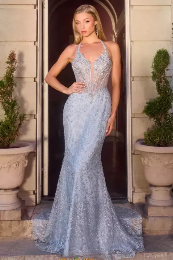 Make a statement in this impressionable La Divine by Cinderella prom dress style 106CD695. This ultra dazzling fitted prom dress displays an applique adorned halter corset bodice with a vivacious deep plunge down the center. Glittering reflective patterns elegantly shimmer throughout the entire closed long skirt.