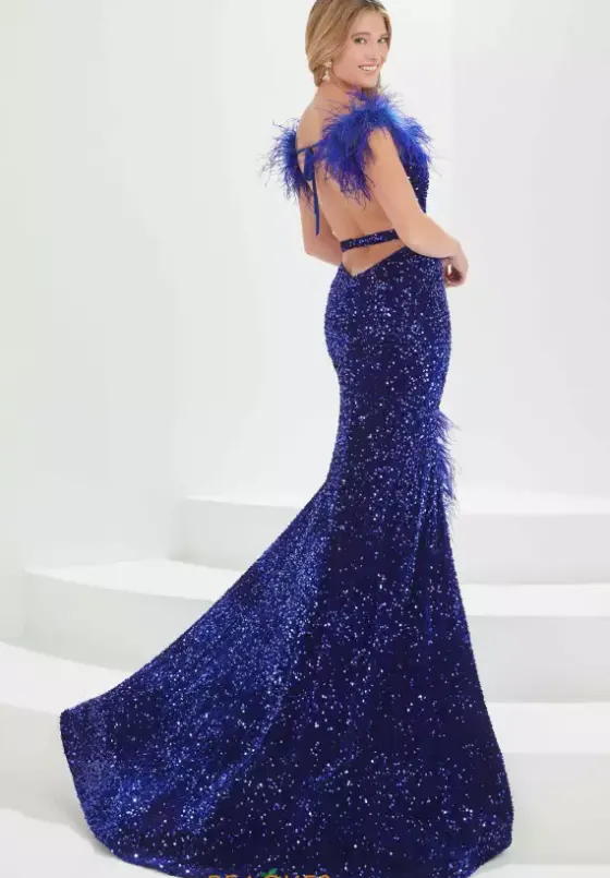 Be fashion forward with this jaw dropping long dress 16004 by Tiffany. Featuring a modest v neckline that is complemented by chic feathers that also match the slit. Fully embellished with eye catching sequins, the stunning fitted dress is accompanied by a sexy open back and a beautiful sweep train that follows behind.