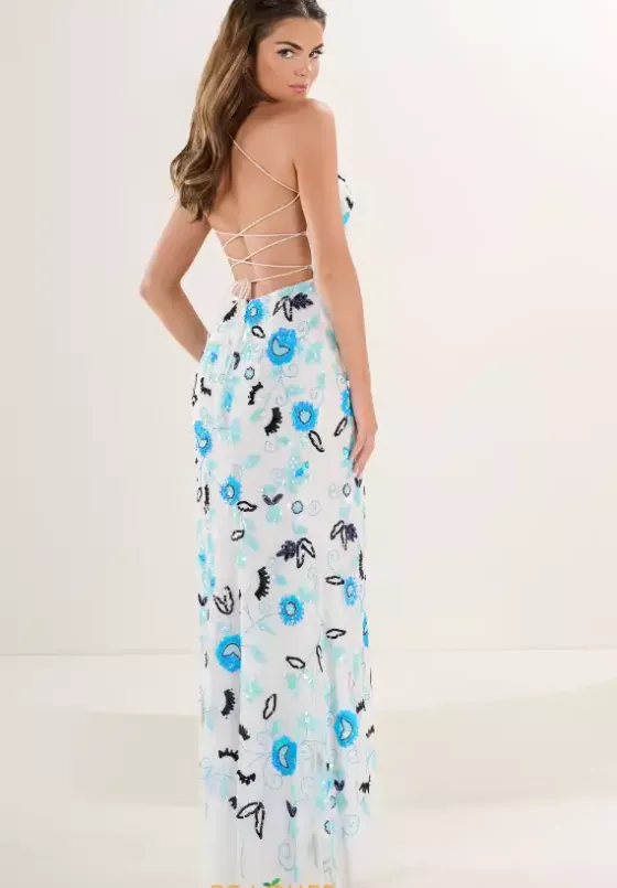 Make a lasting impression when you wear this Tiffany long fitted dress style 16298 to your prom. Available only in this indigo petal color way, this scoop neckline dress has thin spaghetti straps that turn into an adjustable lace up across your open back. The Chiffon material is hand sewn in a boho chic pattern.