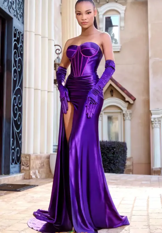 Sleek and elegant, this stretch satin Portia and Scarlett prom dress PS24402 is perfect for anyone looking to be on trend. A fitted corset bodice with a strapless sweetheart neckline along with monochromatic corset boning pairs perfectly with the ruching at the top of the satin skirt that is completed with a dramatic shark bite slit and sweep train for the perfect amount of glam. Gloves come with this dress.