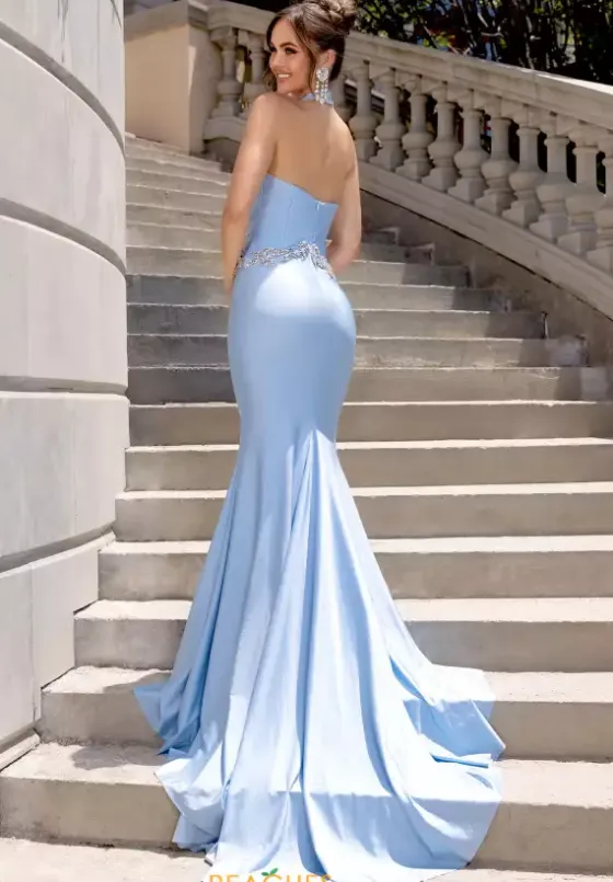Look as if you are about to walk a runway in this long fitted dress made by Portia and Scarlett, style PS25206. This dress has a magnificent healter shaped neckline that has a plunging opening in the very center where there are also incredible beaded details that bring elegance to the entire look. This dress will have heads turning your way.