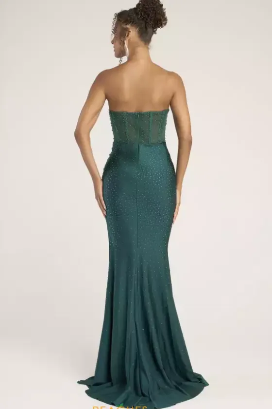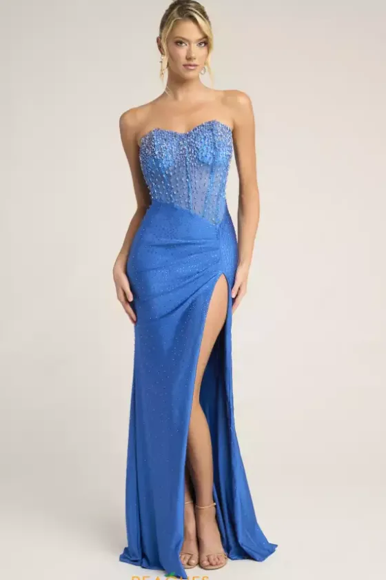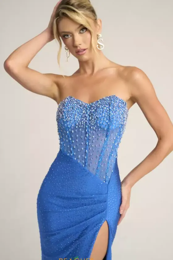Strike the crowd in this bold and sophisticated Portia and Scarlett fitted prom dress style XO012. Trendy details such as a strapless sweetheart neckline, corset bodice, thigh high slit, and sweep train are featured throughout the fitted silhouette. Radiant beads radiate throughout the mesh corset bodice and skirt.