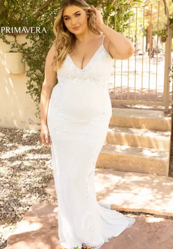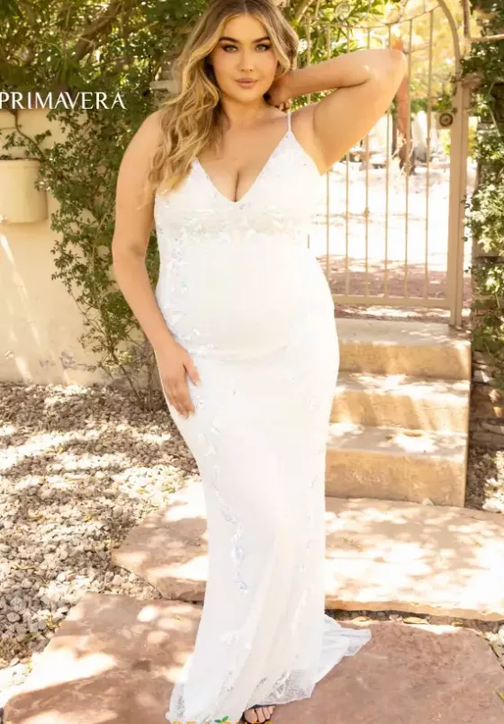 Have all eyes on you when wearing this extravagant dress 14005 by Primavera. Showcasing a modest v neckline with fully beaded straps, this stylish fitted dress is a must have. Entirely garnished with dazzling sequins, the lavish ensemble is also decorated with eye catching beadwork that cascades down the dress.