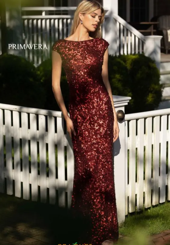 This sophisticated long dress 3796 by Primavera is the perfect choice for your special event. The fitted silhouette is completely embellished with shining sequins that provide an astounding glow throughout and features a train. The high neckline showcases flattering cap sleeves that wrap into a low draped open back.