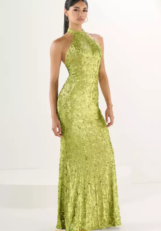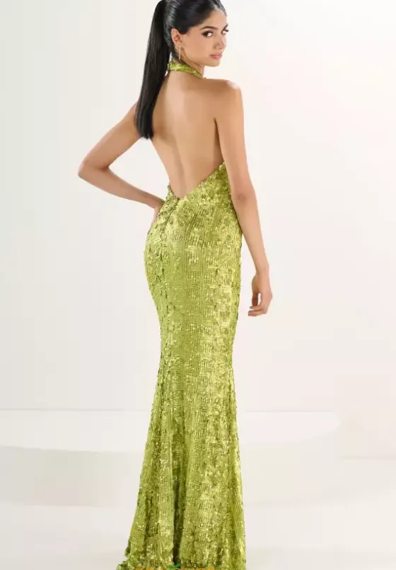 Gain the spotlight when you wear this fabulous Tiffany dress at your event, style 16263. This long fitted dress features a high halter neckline that shows off a sexy open back. Fully embellished with dazzling sequins, this dress will have you shine from any angle. Feel elegant and breathtaking when you choose this dress for your upcoming event.