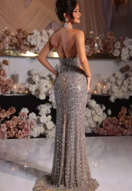 Stay on trend when wearing this marvelous long fitted dress to your next special event from Portia and Scarlet style PS25433C. Showcasing a one of a kind fascinating halter V-neckline that is adorned by dazzling intricate beadwork starting from the neckline following a pattern down to the fitted bottom. Consists of sexy side cut outs and a high thigh slit.