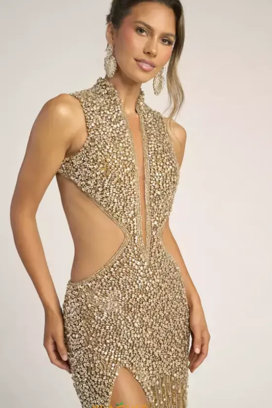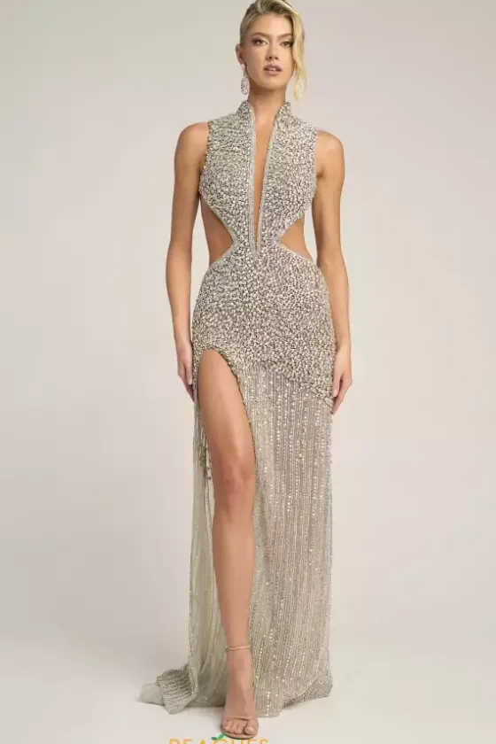 Stand out from the rest in this jaw dropping Portia and Scarlet long dress PS25988C. Available only in this gorgeous peacock color, this dress has an unique plunging deep v neckline with a raised collar. The sides of the dress are cut out to define your shape. The long fitted skirt falls to the floor with stunning bead work.