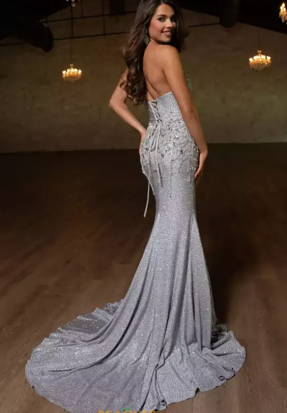 Make a lasting impression in this strapless dress from Rachel Allan 70742. The plunging v neckline has a sheer illusion insert with side bodice cutouts. The back is adjustable with a lace up corset. Glitter jersey material shimmers with amazing bead work that travels down the skirt from the small of your waist.