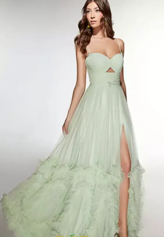 Offered in sage or rosewater colors of soft net fabric, this stellar Alyce Paris long dress style 62043 is the picture perfect choice for prom. This phenomenal gown showcases a lace up back corset with adjustable spaghetti straps, sweetheart neckline and front cut out. The a line, long skirt has ruffle detailing on the bottom half with a floor sweeping hem.