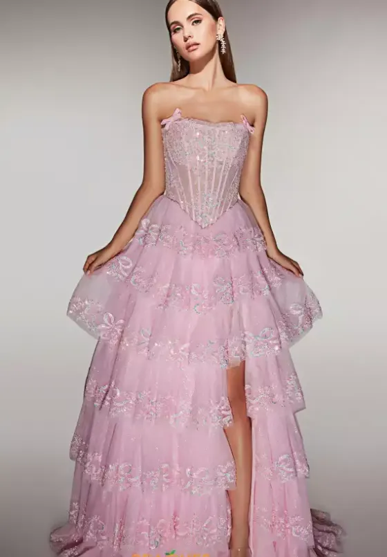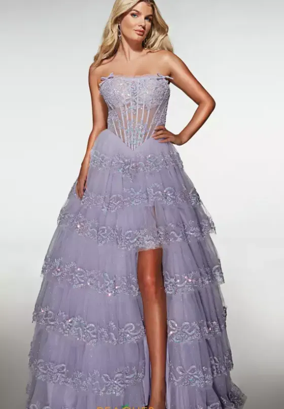 Everybody’s eyes will be glistening when they look at you wearing this sequin encrusted Alyce Paris floor length prom dress style 62191. Dainty bows are displayed on each end of the strapless neckline while reflective sequins dazzle across the front and back of the fitted corset bodice. Delicate tiers of tulle display matching appliques on each individual hem for extra radiance.