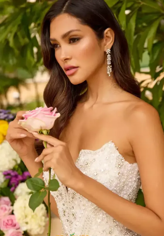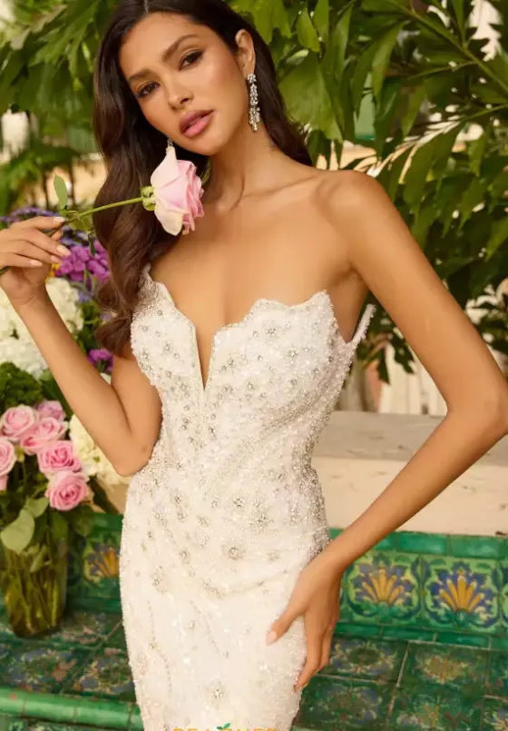 Have a major fashion moment in this all over beaded Ava Presley fitted dress style 47244. This stunning strapless v scalloped has scalloped edges and dip open back. The hand sewn bejeweled dress has the perfect combination of beads, sequins and pearls. The dress has a fabulous train and front thigh high side slit.