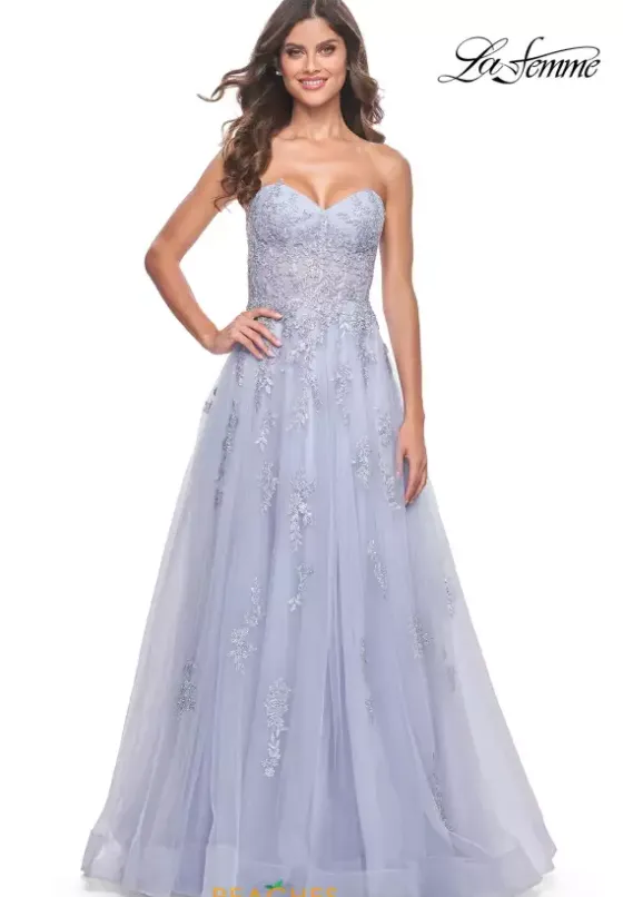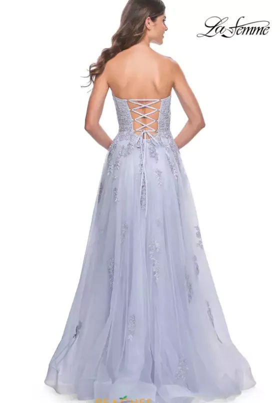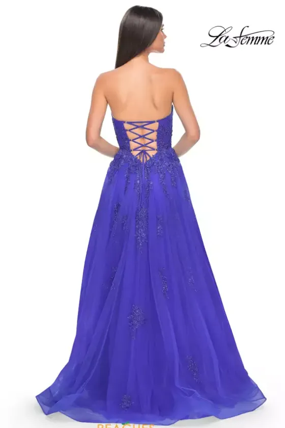 Available in the trendiest colors, A-line prom dress 32084 designed by La Femme is the perfect pick for your special event. This corset A-line dress features a strapless sweetheart neckline along with an adjustable lace up closure while the flowy skirt reveals a hidden thigh high slit and horsehair hem. Beaded lace details are featured throughout the entire dress for a stunning sparkle.