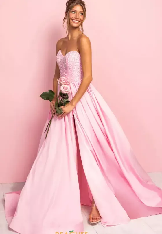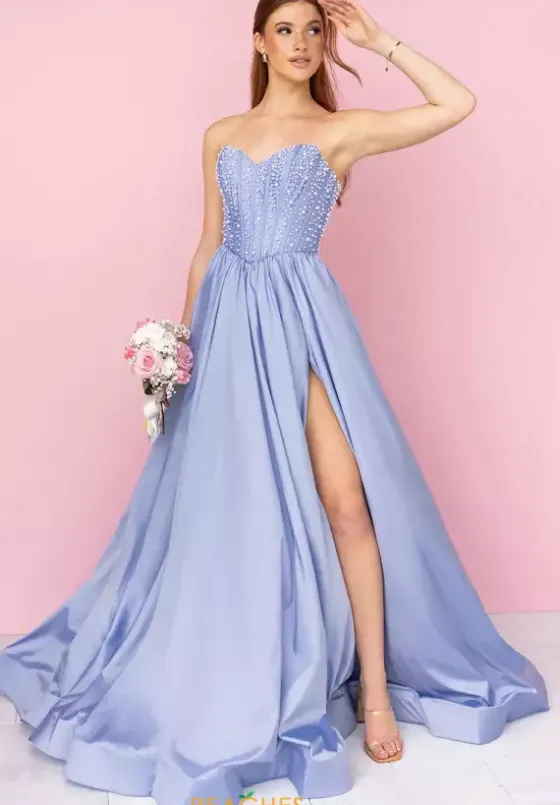Dance the night away in this fabulous Portia and Scarlett a line dress style XO178. The beautifully hand beaded strapless sweetheart neckline corset bodice has pearl and beading details. The long taffeta skirt falls from your waist with a thigh high slit. The stunning train trails right behind you.
