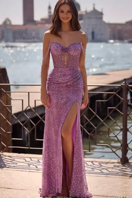 Sparkle and shine all night long in this scintillating Sherri Hill long dress style 57514 encrusted with sequins and beads throughout. This glistening gown features a corset bodice with hanging beaded off the should cap sleeves, sweetheart neckline with illusion insert and beaded fringe. The long slim skirt has ruching, high front side slit and back sweep train.