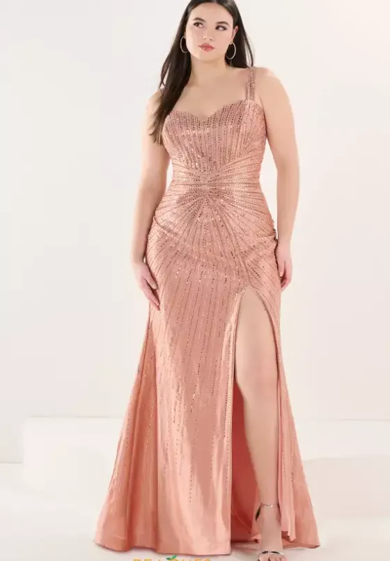 Look runway ready in this striking long dress designed by Tiffany style, 16273. This fitted silhouette is entirely decorated in eye catching beadwork and has satin material, ensuring a full glam look. Highlighting a charming sweetheart neckline supported by two lovely straps. Featuring a striking long train and a high high slit.