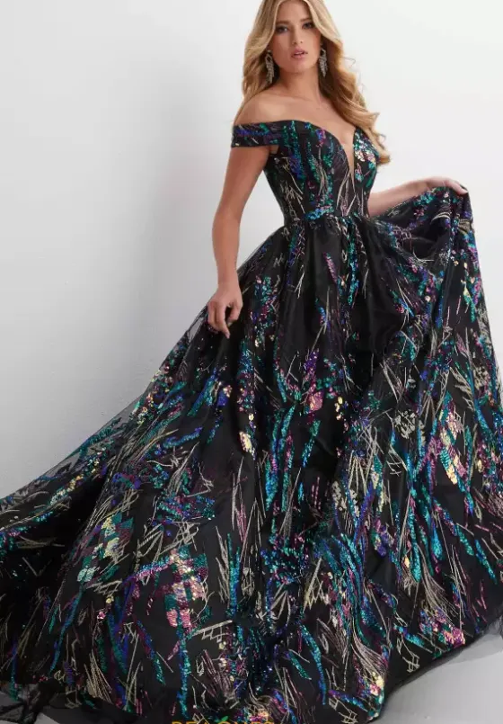 Have a memorable night in this enchanting Panoply long dress 14128. Ravishing ball gown reveals an off the shoulder neckline with a low cut. Fitted bodice is beautifully embellished with dazzling beadwork and eye catching sequins that matches the full skirt. The perfect finishing touch to this gorgeous long dress is the sweep train that follows behind.