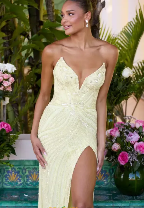 Feel like you just step foot of the red carpet when wearing this exquisite long dress by Ava Presley, style 47123. Featuring a fitted silhouette with a strapless v neckline. this ensemble is fully adorned with beautiful beadwork thats sewn in an intricate pattern and glistening sequins that are sure to have you sparkle all night long. A thigh high slit is the perfect final touch.