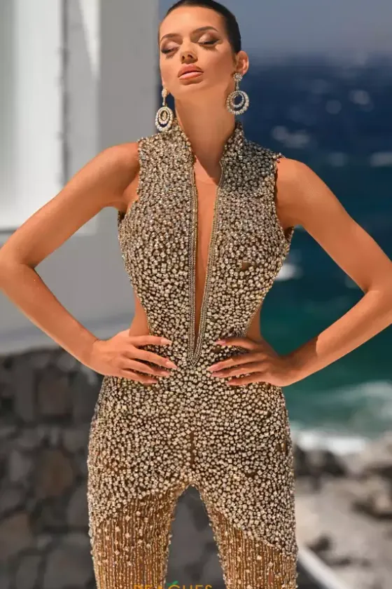 Have a major fashion moment in this jaw dropping Portia and Scarlett jumpsuit style PS26466C. Available only in gold, this high collared top has a deep plunging v neckline with a sheer illusion insert. The gorgeous hand sewn rhinestone beads and gems bedazzle the look from top to bottom making it a great choice for your fun fashion.
