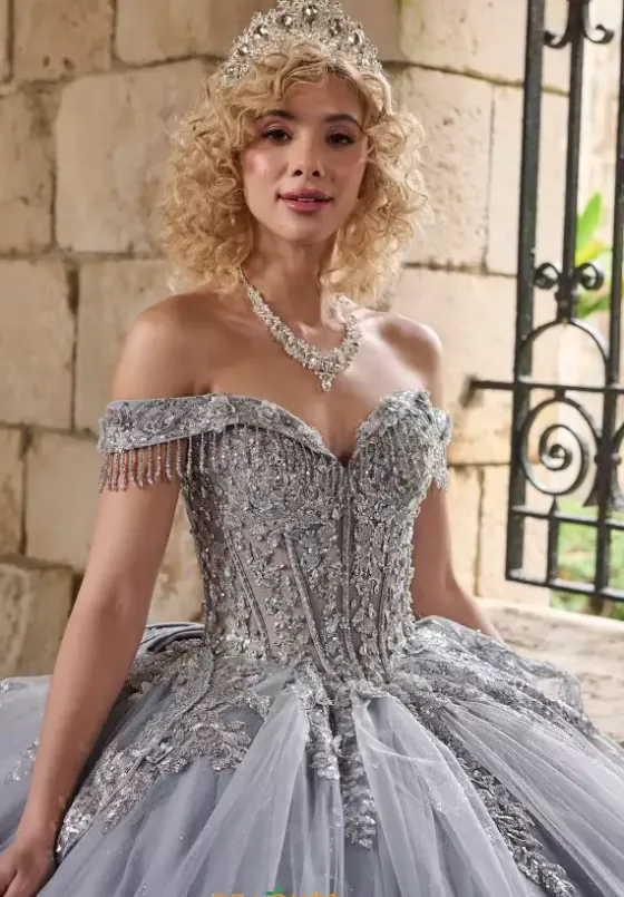 Experience an enchanting night when wearing this long ball gown by LizLuo Quinceanera, style 26122. Featuring a lovely corset and a sweetheart neckline with off the shoulder cap sleeves with dazzling fringe. The voluminous sparkle tulle skirt has a perfect bow that adds to the true beauty. This ensemble is adorned in applique and beadwork, making you sparkle all night. The long train finishes off this enchanting look.