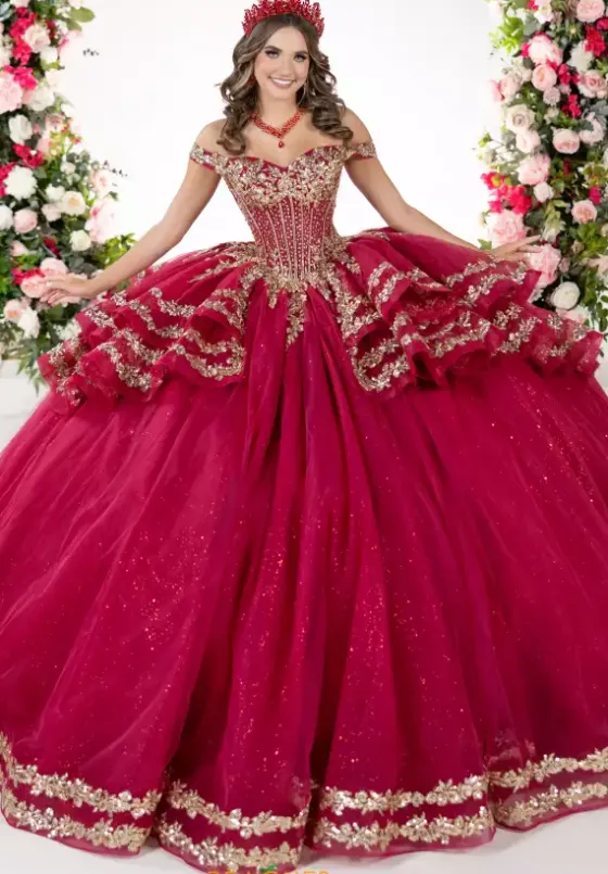Show up to your quince in this jaw dropping LizLuo Quinceanera ball gown style 26138. This long waisted corset bodice with an off the shoulder cap sleeve sweetheart neckline. The peplum first layer tulle skirt flows from the hips trimmed in metallic appliques and those matching appliques trim the hem of the ball gown skirt.