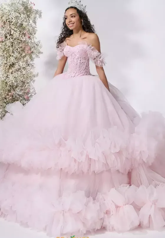 Feel very avant garde in this unique LizLuo Quinceanera ball gown style 80049. A must have choice for your special day, this sheer illusion drop waist bodice has a sweetheart neckline with off the shoulder tulle cap sleeves. The full skirt is layered in two with rag cut tulle poufs edging the hem of each layer.