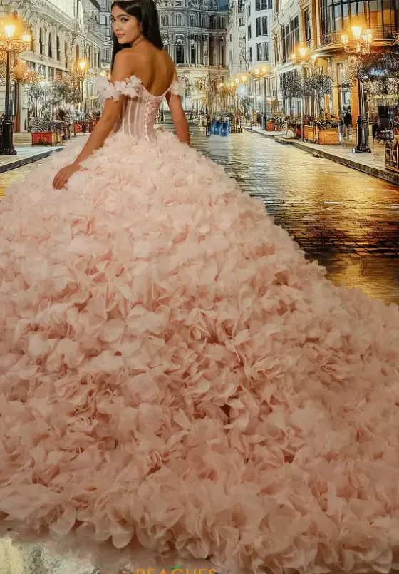 Show off your inner fashionista and radiate in this jaw dropping Princesa Quinceanera ball gown style PR30232. The sheer illusion drop waist line bodice showcases detachable off the shoulder ruffled cap sleeves. The full ball gown skirt is made from ruffled organza and features pockets.