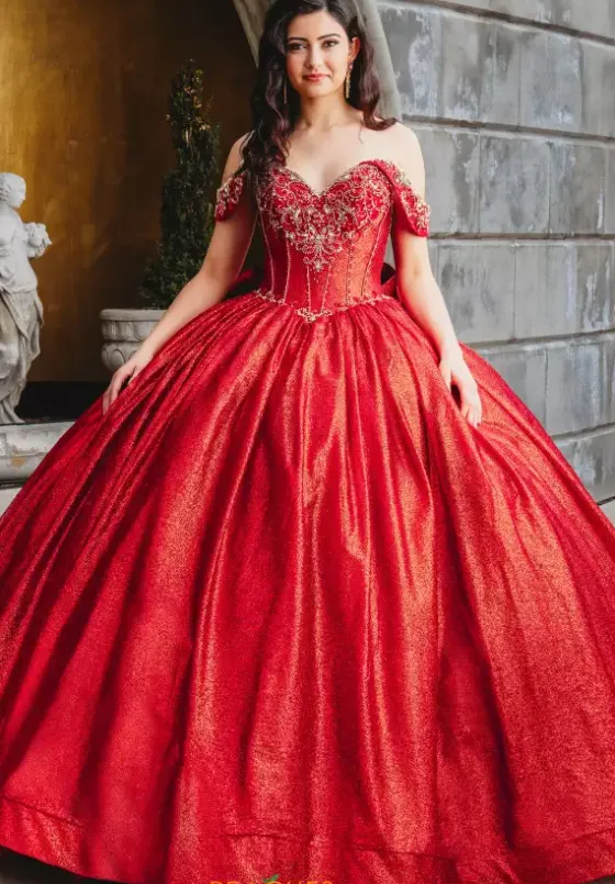 Jaw dropping Amabelle quinceañera dress style Q1013 features a regal fitted bodice embellished in ornate beadwork, adding lavish and sparkling detail. The sweetheart neckline displays beaded cap sleeves that look princess-like. The glittering voluminous skirt is complete with a train and is topped off with a dramatic bow. Detachable bow included.