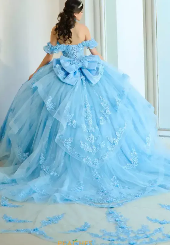 Feel regal when you wear this Amabella quinceanera dress on your special day, style Q1065. This long waisted bodice has a deep v neckline with ruffled off the shoulder cap sleeves. The dress comes with a chocker necklace made from the matching appliques from the gown. The tulle ball gown skirt has a bow in the back with a detachable long train.