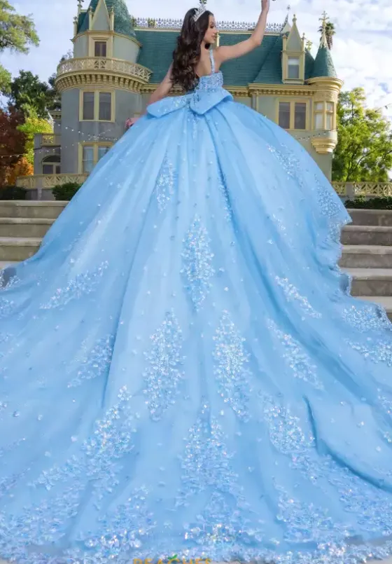 Be the center of attention when wearing this fabulous quinceanera dress by LizLuo Quinceanera, style 26086. Featuring a sweetheart neckline with delicate straps and puffy sleeves that are made out of tulle material adorned with floral applique. Following to a gorgeous corset lace up back that will hug your body beautifully. This ensemble is fully embellished with glistening beadwork patterns and lace throughout the dress. For the perfect final touch it has a long and unique train with a one of a kind bow.