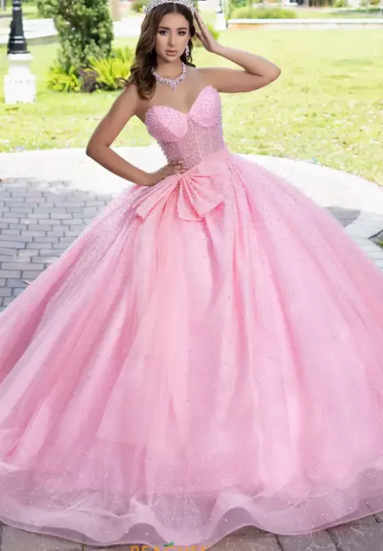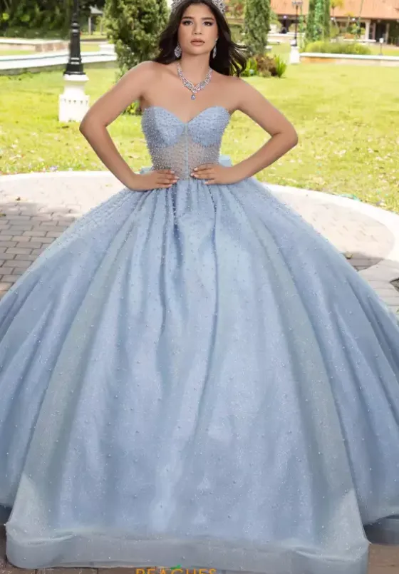 Be the center of attention wearing LizLou Quinceanera dress 56538 for your special event. This ballgown showcases a tasteful sweetheart strapless neckline with optional cap sleeves with a sheer corset bodice. Completely embellished with unique beadwork and soft glitter tulle, this dress features a long sweep train and completed with a must have bow.