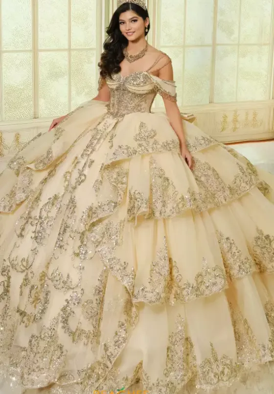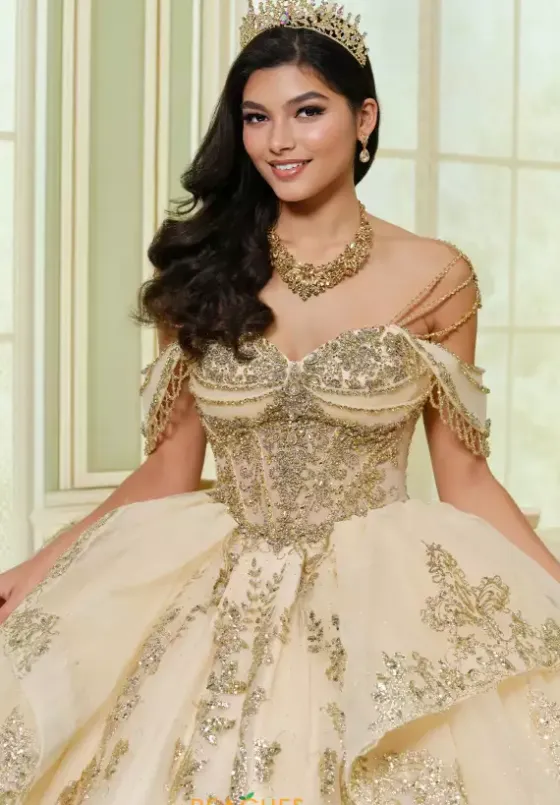 Dance all night long in the enchanting Princesa Quinceanera gown, style PR30205. This breathtaking gown features detachable off-the-shoulder straps intricately adorned with beading and fringe for a touch of glamor. The beaded bodice showcases a stunning pattern and features a lace-up back with a modesty panel for comfort and elegance. A matching capelet pairs beautifully with the look, adding a regal touch. The full tulle skirt flares out gracefully, creating a dramatic silhouette perfect for your unforgettable moment. To complete the look, a detachable bow adds the final touch of whimsy and charm.