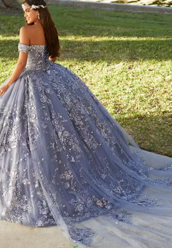 Exude elegance in captivating ball gown dress 56479 by Tiffany Quinceanera. This dress is available in two stunning colors and showcases an off the shoulder neckline with off the shoulder cap sleeves for an elegant touch. The voluminous tulle skirt displays a tulle cathedral train to up the drama. Shine like never before with shimmering appliques and beadwork.