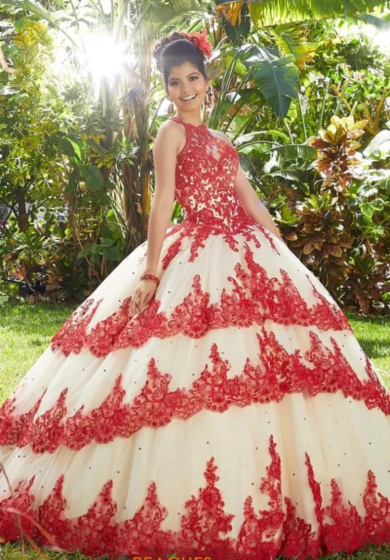 We are loving the contrasting appliques on this gorgeous Valentina ball gown 34014. Versatile and vivid, this one of a kind gown features a high halter neckline and a multi layered tier skirt. Intricate embroidery illustrates a phenomenal design that adorns the corset bodice and full tulle ball gown.