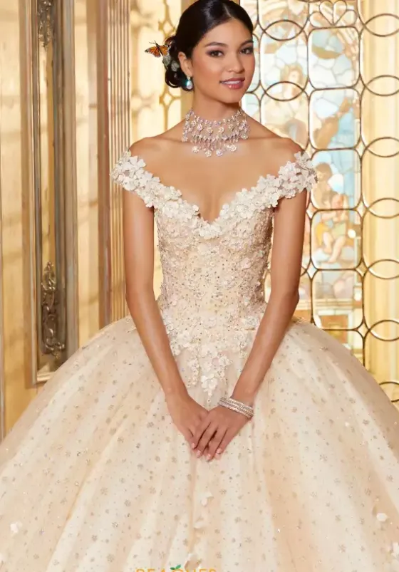 Lovely ball gown dress 34063 by Vizcaya is absolutely breathtaking. This stunning bodice is adorn in three dimensional flowers that trim the off the shoulder sweetheart neckline. The full tulle layered skirt cascades those flowers down the bottom of the skirt with sparkling rhinestone beadwork throughout the tulle. Matching shawl included.